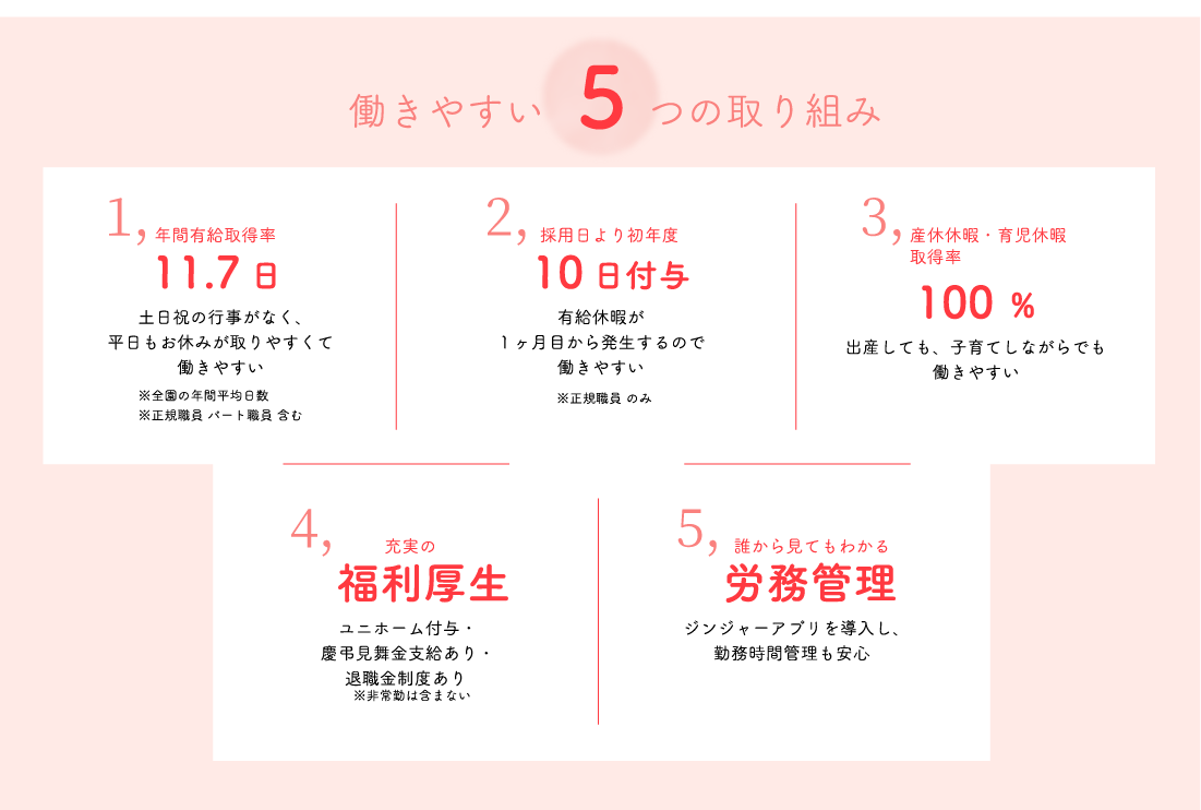 | 有給休暇 | 採用日より初年度10日間付与 |