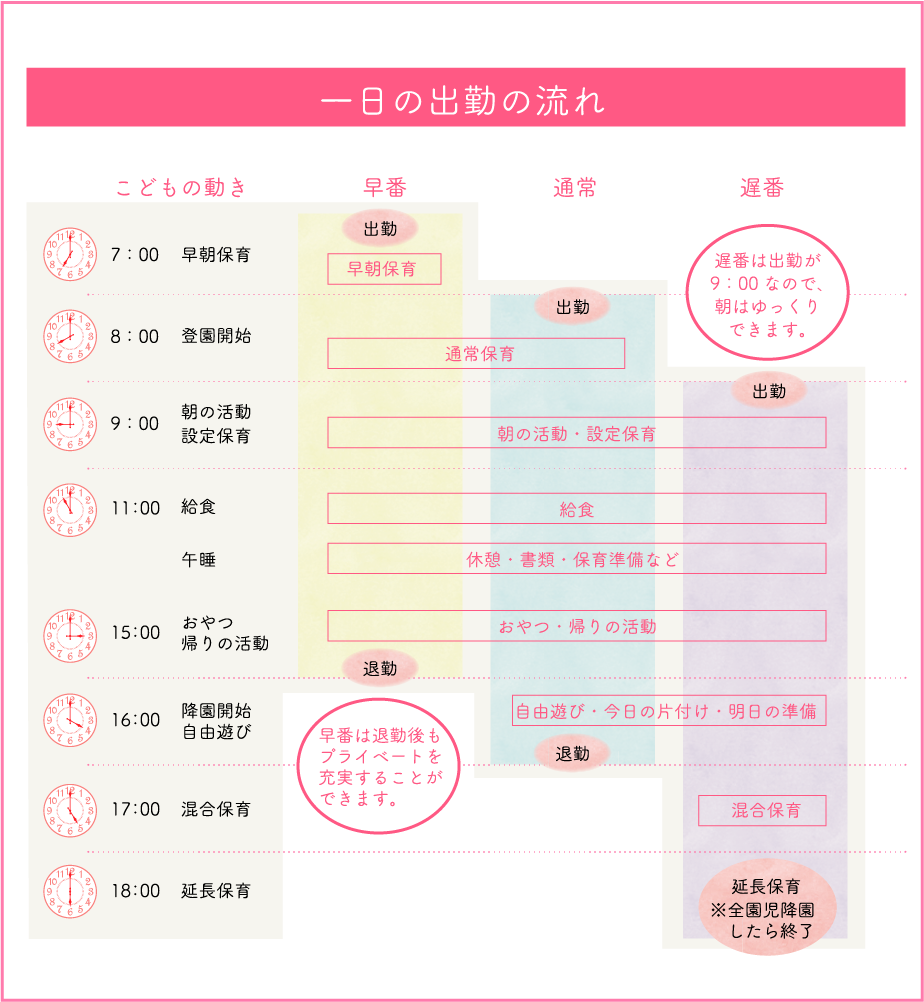 | 給与 | ・短大・専卒 193,200円 + 処遇改善手当 + 通勤手当(上限あり) ・4年制大卒 197,300円 + 処遇改善手当 + 通勤手当(上限あり) ※その他諸手当:早朝当番手当:1,000円/回 土曜当番手当:4,000円/全日・2,000円/半日 ※時間外手当(時間数に応じて) ※ 昇給年1回(4月) |